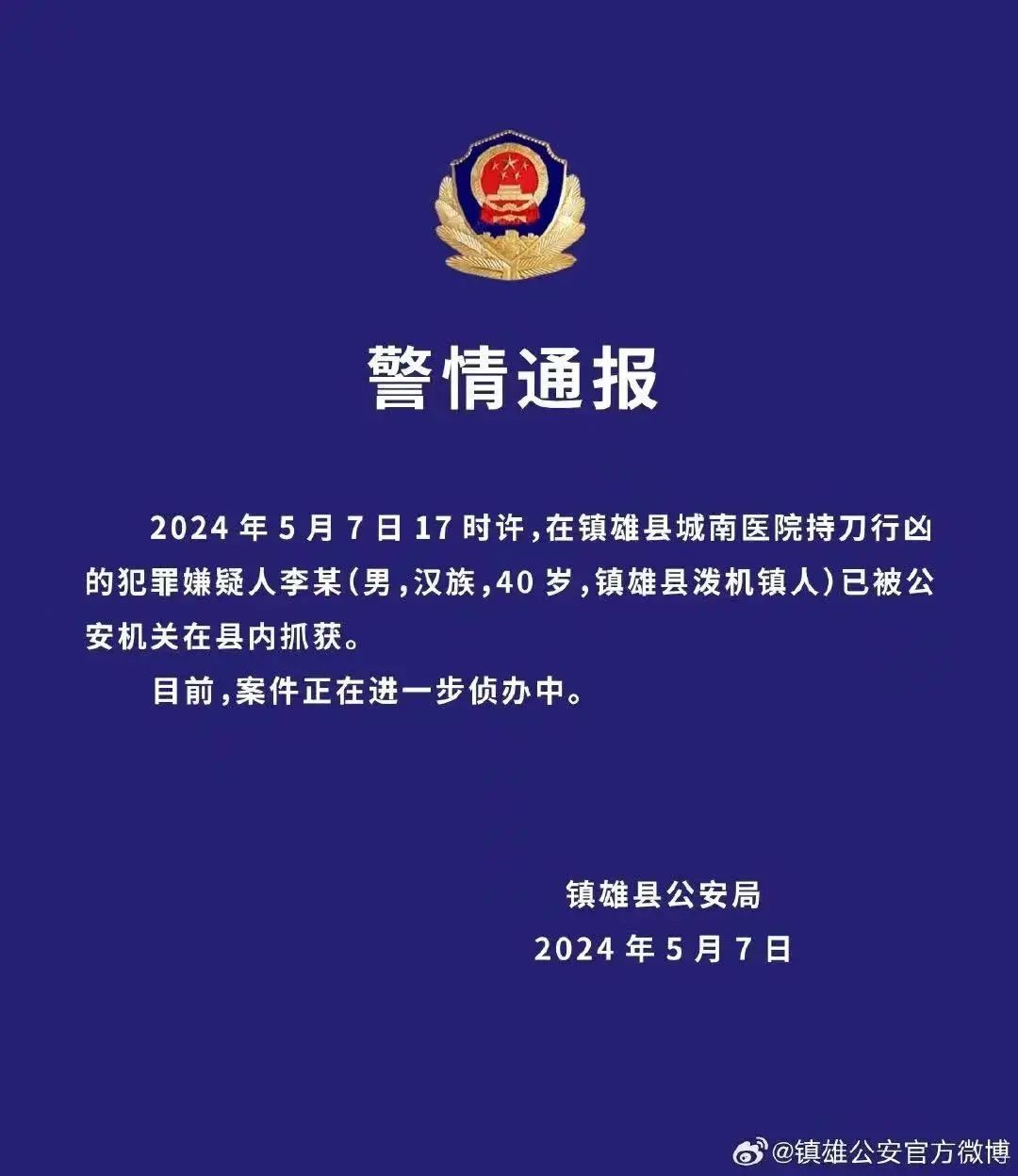 【镇雄持刀行凶犯罪嫌疑人李某已被抓获】此前报道