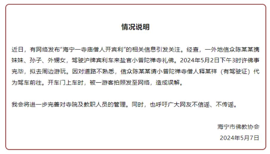 【海宁一寺庙僧人开宾利?官方发布情况说明】