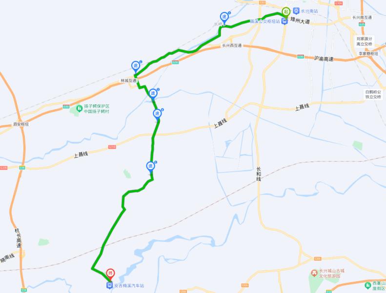 长兴画溪公交枢纽站—和平路口—三星斗新村—画溪桥路口—长桥东—长桥西—姚家桥东—变电所—姚家桥西—新老路岔口—下寺—技校站—环桥—乌泥斗—苗圃—方中—杨家杆—电炉厂—蒋家村—大云寺开发区—大云寺—林城开发区—林城新街—林城新菜场—林城老菜场—林城小学路口—桥南—小菜园—庙前—林城工业园—阳村—三号桥—杨家墩新村—杨家墩—方塘殿—贺家村—笕桥站—笕桥村委—笕桥新村—南首—㘰角—王家村—中管—石塘—章湾村—梅溪公交站