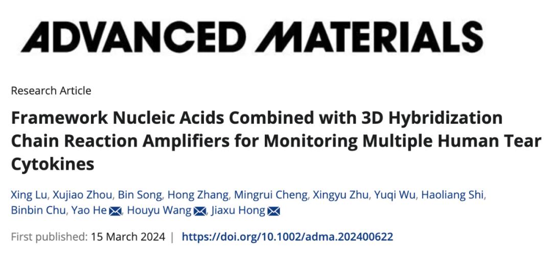 近日,复旦大学附属眼耳鼻喉科医院洪佳旭主任医师与苏州大学功能纳米与软物质研究院王后禹教授、何耀教授合作,在 Advanced Materials 期刊发表了题为:Framework Nucleic Acids Combined with 3D Hybridization Chain Reaction Amplifiers for Monitoring Multiple Human Tear Cytokines 的研究论文。
