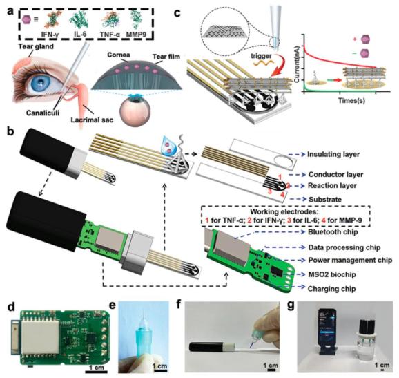 该研究开发了一种无线便携式泪液分析传感器,仅需3mL泪液即可灵敏检测泪液中的干眼综合症(DES)相关的四种细胞因子(IFN-γ、IL-6、TNF-α、MMP-9),检出限低至0.1 pg/mL。该研究为开发个性化、准确诊断多种眼病的泪液传感器奠定了基础。