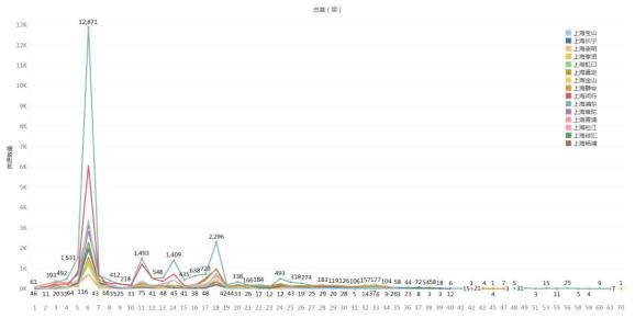 将各小区数据按照每平米单价进行降序排列,用柱图显示。房源数量数据用红色折线图表示。徐汇区、静安区、长宁区的房价明显高于其他区。