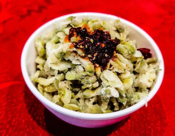原料:新鲜槐花、面粉、油泼辣子、蒜泥、食用盐。