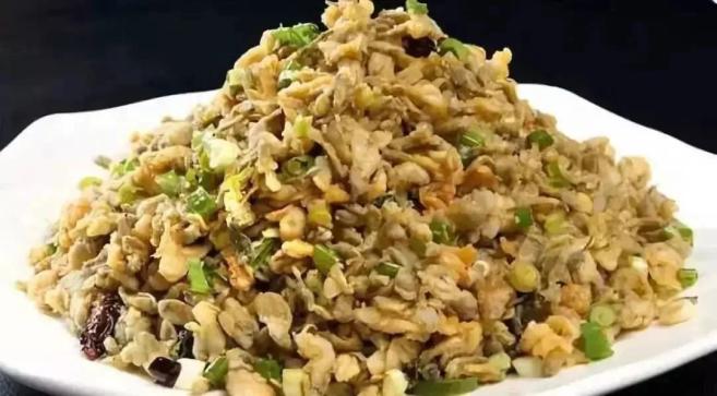 3.蒸熟后的麦饭盛于碗内浇一小勺油泼辣子,放少许食用盐、蒜泥等辅料,均匀搅拌后即可食用。