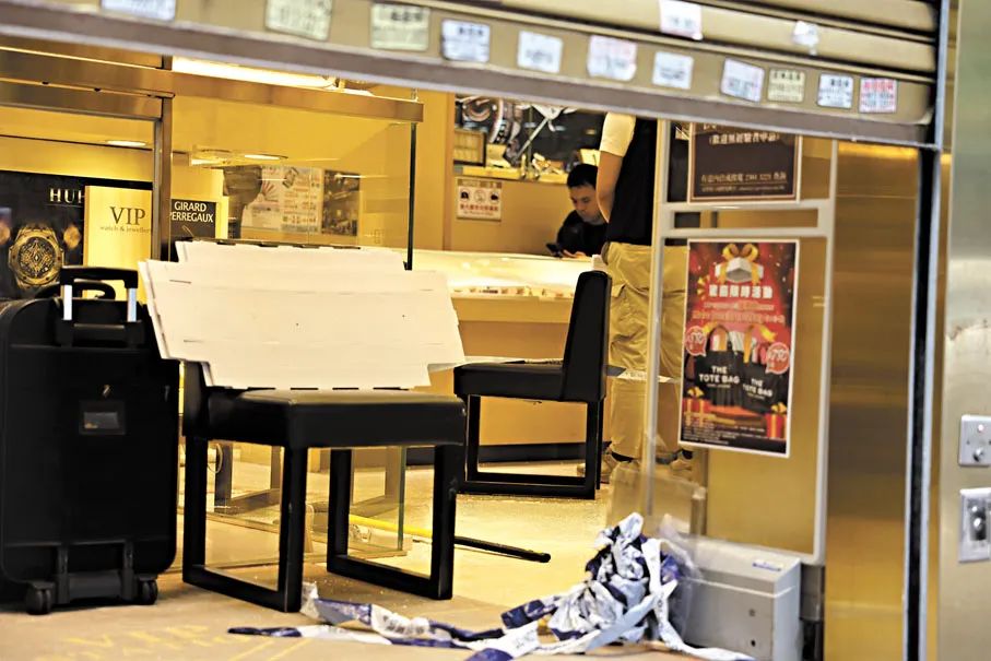 2018年7月1日,钟表珠宝店“名人站”被3名持利刀和铁锤的人打爆玻璃饰柜,劫去总值2310万元的名表及手带。抢劫过程约一分钟,另外两名同伙负责驾车及把风,事后将车驶至新田担竿洲路烧毁。