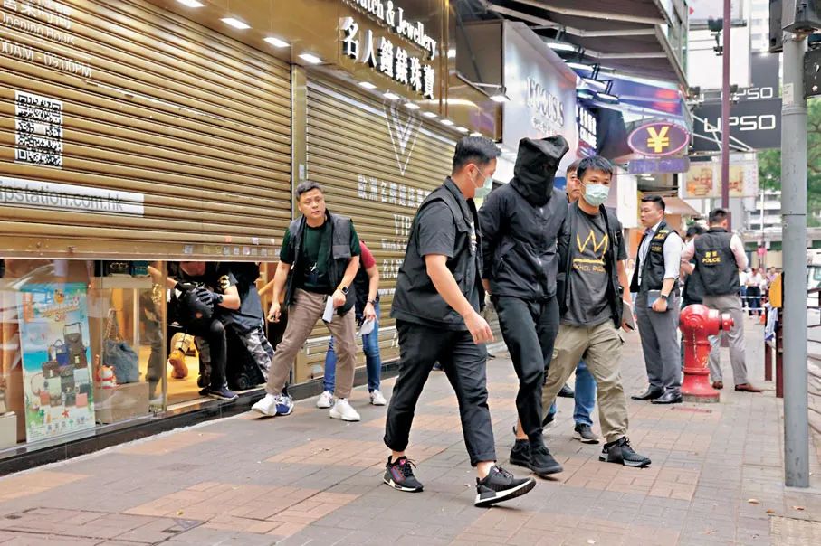 嫌犯弃下刀锤投降,事后被黑布蒙头由探员押解带返警署扣查。图源:香港文汇报钟表珠宝店“名人站”: