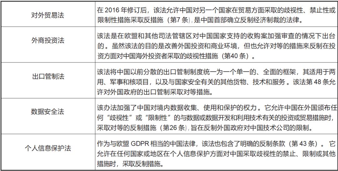 下表为中国目前涉及反制裁的其他法律规范: