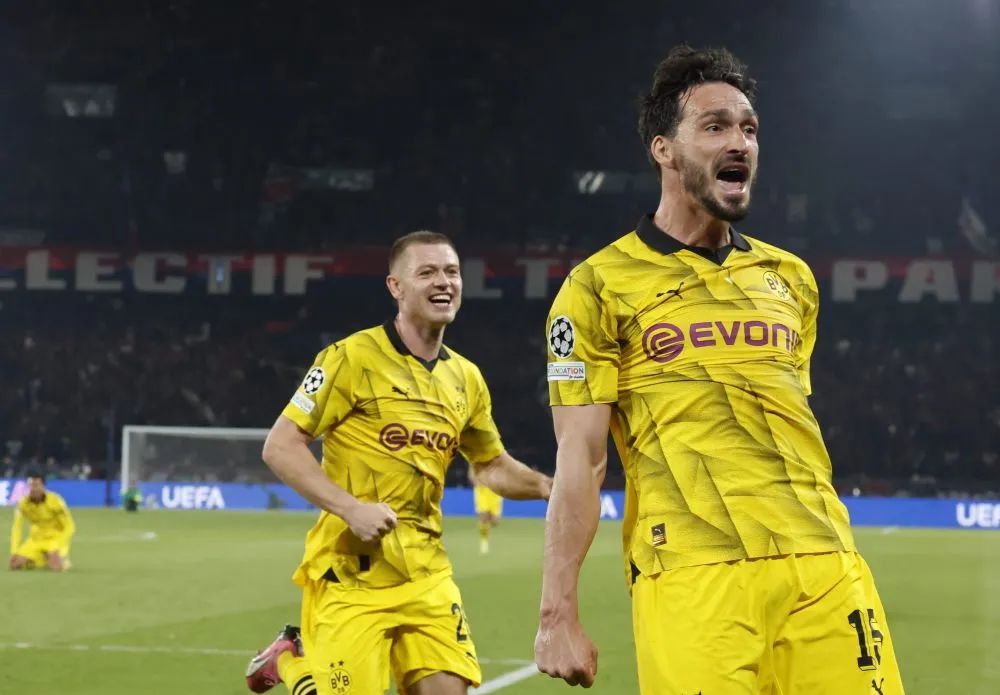 5月7日,多特蒙德队球员胡梅尔斯(前)庆祝比赛胜利。新华社发(亨利·斯瓦里克摄)皇马决赛的对手将是德甲球队多特蒙德,他们在半决赛两回合2比0战胜巴黎圣日尔曼,队史第3次挺进欧冠决赛。再次闯入决赛,多特蒙德队自然期待第二座“大耳朵杯”。中场大将埃姆雷·詹直言,球队接下来的目标就是夺冠。主帅泰尔齐奇说:“我知道我们不是热门,无论面对哪支球队,都将非常困难。但决赛只有一场,在一场定胜负的比赛中,一切皆有可能,我们已经证明了这一点。”