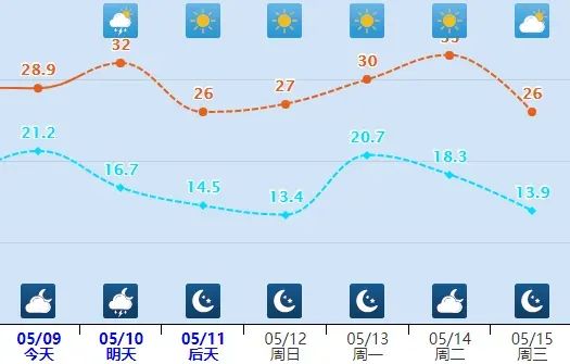 据省气象台预报,预计5月9日下午至10日夜间,我省有一次强对流天气过程,自西向东将先后有雷阵雨或阵雨,局地伴有短时大风、短时强降水、冰雹等强对流天气,其中张家口、承德、唐山、秦皇岛、保定、石家庄局地有中到大雨。9至11日,风力较大,北部地区局地阵风可达9~10级。11至12日,受冷空气影响各地气温普遍下降,12日早晨张家口、承德、保定西北部最低气温将降至2~9℃,坝上地区有霜冻。