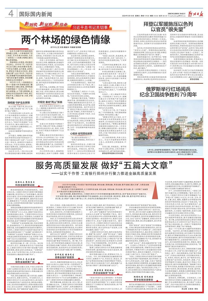 锚定顶层部署,紧跟政策导向,工商银行郑州分行牢牢把握高质量发展首要任务,坚持“服务实体经济”金融宗旨,切实加强对重大战略、重点领域和薄弱环节的金融服务,加大对科技创新、绿色转型、普惠小微、数字经济等方面的支持力度,全力做好“五篇大文章”核心工作,在经济社会高质量发展中书写大行担当。