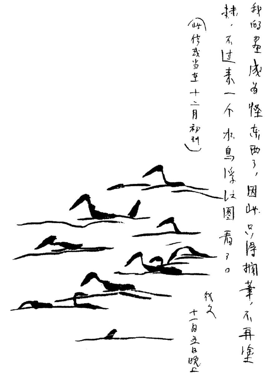 我的画成为怪东西了,因此只得搁笔,不再涂抹,不过来一个水鸟浮江图看看。(此信或当在十二月初到)(沈从文绘,见一九三〇年十一月五日复王际真信)鲁迅内心反应的过程,在后来给钱玄同的两封信里有清晰的呈现:《京报·国语周刊》七月十二日第五期发表了沈从文的民歌体诗作《乡间的夏(镇筸土话)》,鲁迅当天给周刊编辑钱玄同写信,说:“这一期《国语周刊》上的沈从文,就是休芸芸,他现在用了各种名字,玩各种玩意儿。欧阳兰也常如此。”
