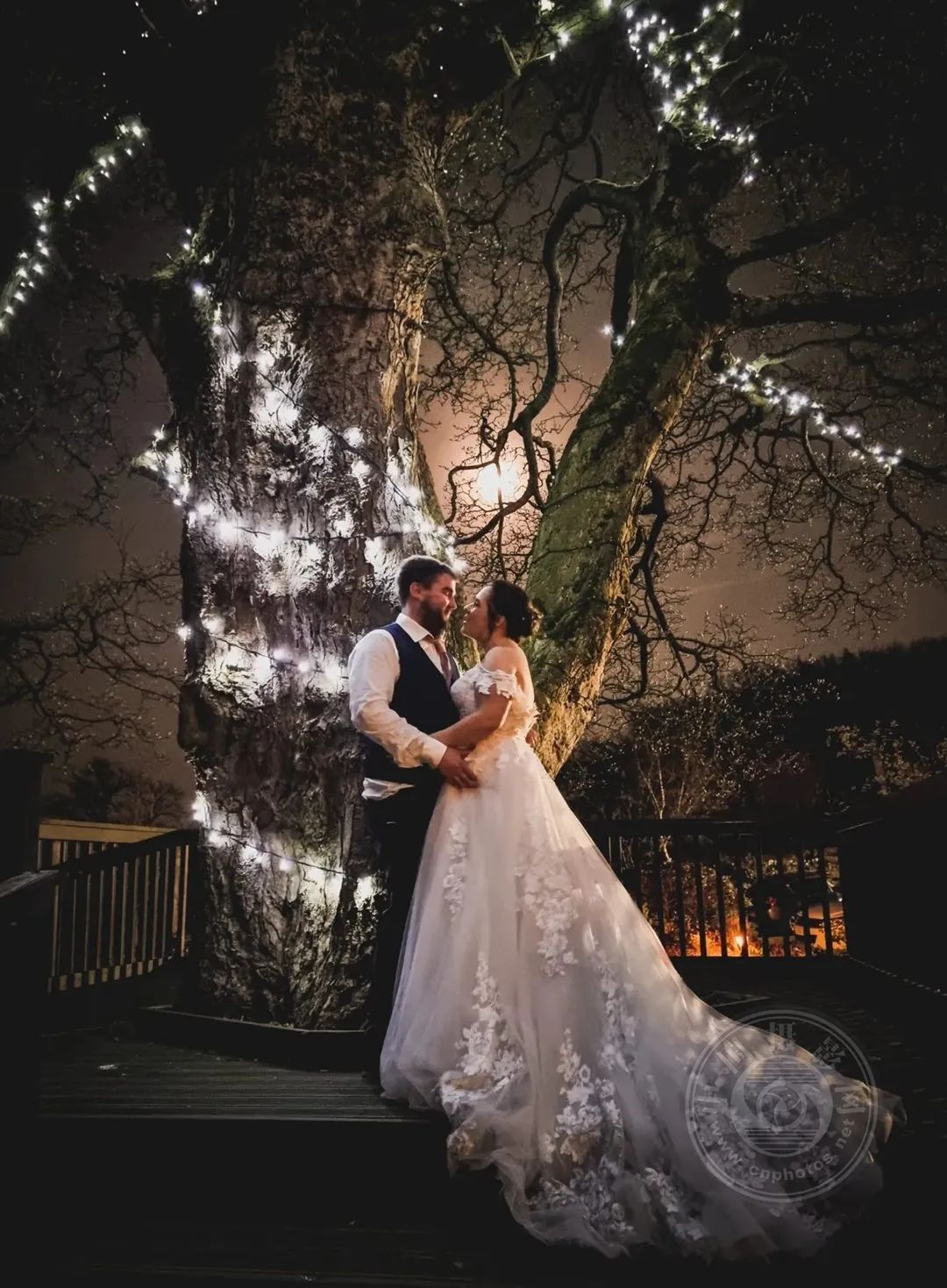 这张照片是我在参加朋友的婚礼时拍的。她的摄影师在拍到我朋友想要的夜景照片之前就离开了,因为会场周围点缀着许多童话灯。她问我能不能拍一些。我没有带相机,只有一部三星 S21 手机。这个小地方很美,树后的满月是拍摄这张照片的最佳地点。
