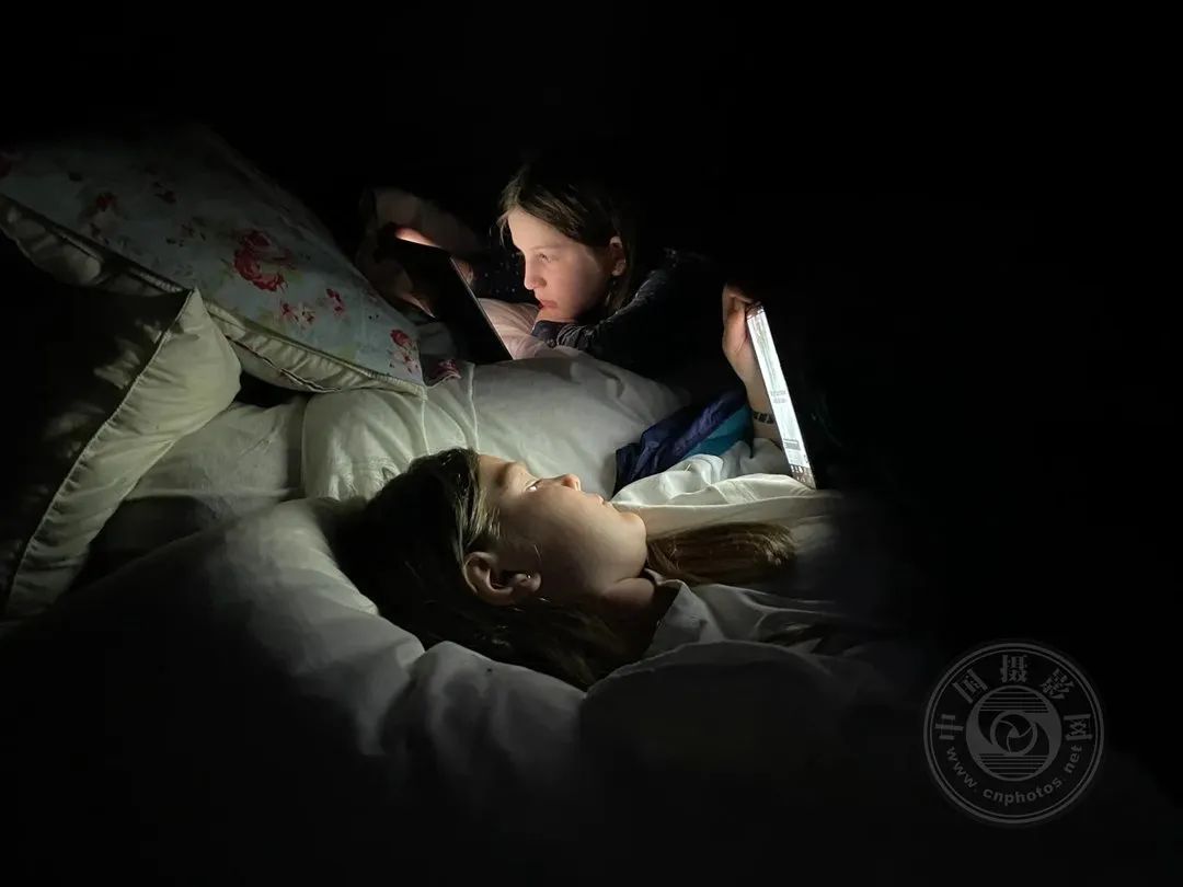 在一次过夜活动中,孩子们用iPad阅读和玩游戏。