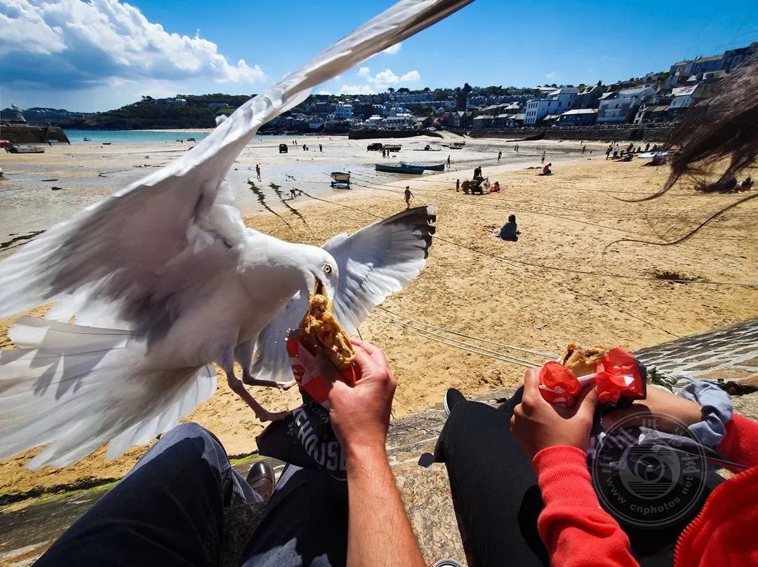 虽然我们都知道生活有时难以预料,但在某些情况下却很容易忘记这一点。事实证明,即使是在圣艾夫斯阳光明媚的日子里坐下来享用新鲜的康沃尔馅饼,完全放松警惕也会导致一系列令人惊讶和轻微震惊的事情发生。排了几分钟队后,我们终于可以坐下来享受美食和美好的天气了。为了捕捉这一刻,我拿出手机开始拍摄美丽的圣艾夫斯港。由于第一张照片拍得非常糟糕(我把它归咎于面饼),我立即返回相机应用程序,尝试再拍一张。一瞬间(如图所示),我的面饼飞走了,我的大脑在试图理解刚刚发生了什么,我什么也做不了了,只能站起来重新排队......