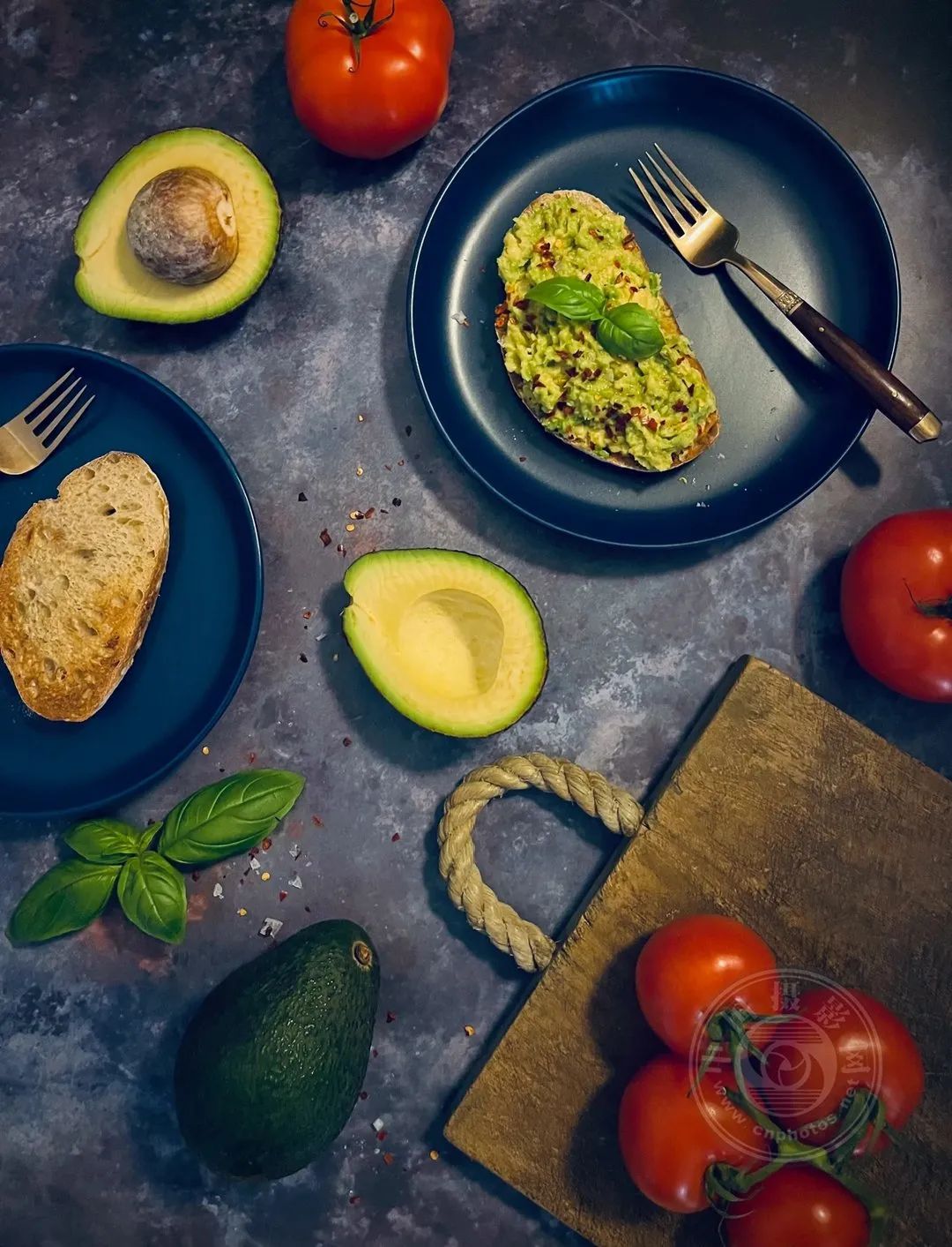 我手头有多余的鳄梨和一些西红柿,所以决定尝试拍摄早餐的照片。我选择了暗色系的风格,以突出食物的丰富口感。