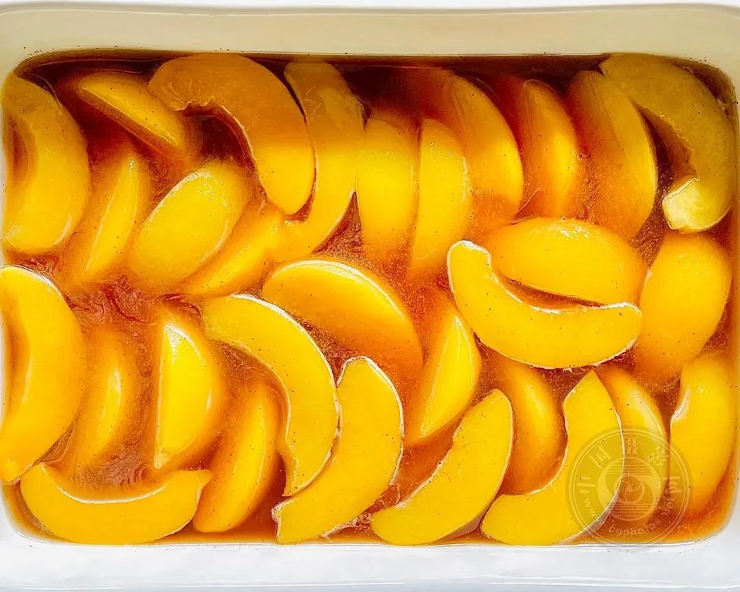 一罐多的水蜜桃片躺在糖浆里,准备被烘烤成甜点,最后配上冰淇淋。桃片的相似度很高,鲜艳的黄色与糖浆和托盘形成鲜明对比。我觉得这幅作品传达出了它们的美味。我把托盘放在厨房的窗台上,把智能手机放在托盘上方,让阳光洒在桃子上。