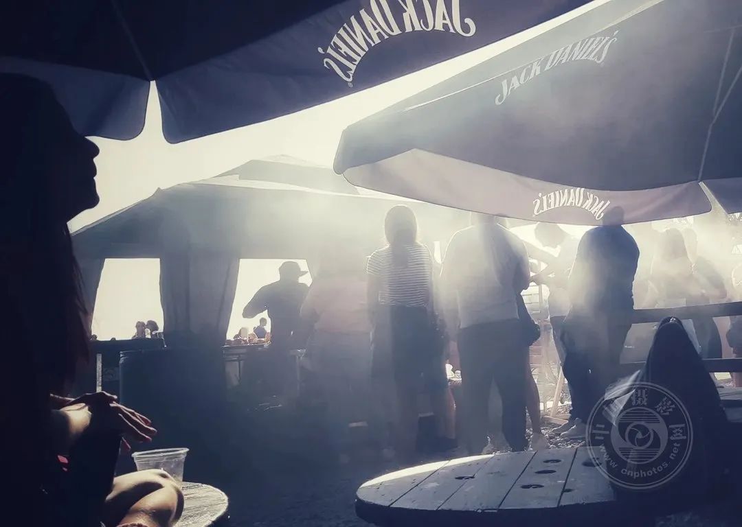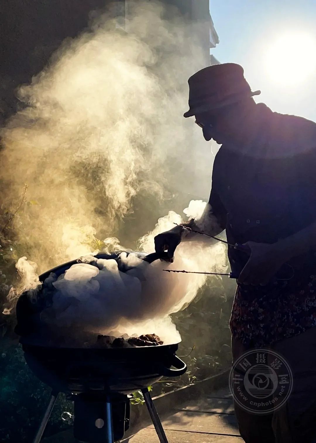 夏日的阳光照亮了从便携式烧烤炉中冒出的浓浓冷凝水,投射出我朋友的剪影。逆光、烟雾和剪影给画面增添了迷人的异域风情。其他几位朋友看到了我手机上的这张照片,随后排队摆出了一个与烟雾重现效果的姿势。