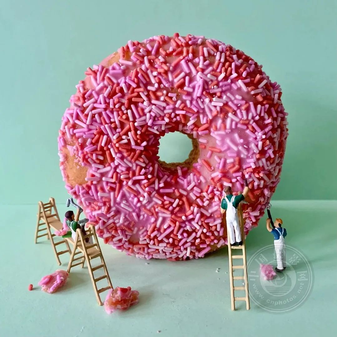我经常用家里餐桌上的一个小灯箱创作想象中的场景。这些场景把我带到了另一个世界。这一次,我看着甜甜圈上的所有糖丝,想象着每一缕糖丝都是由手工单独添加的。于是,我想到了“小人”在甜甜圈上添加装饰的概念。