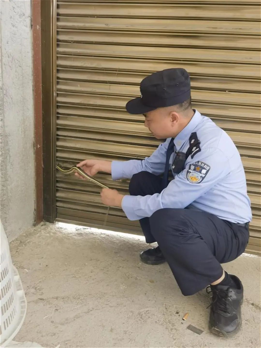 到达后,民警发现这条菜花蛇正试图往卷闸门的缝隙里钻,被困在了狭窄的门槽中。为了安全救出菜花蛇,民警与村民一起小心翼翼地操作卷闸门,缓缓将门卷起。在警民共同努力下,菜花蛇终于被解救出来。