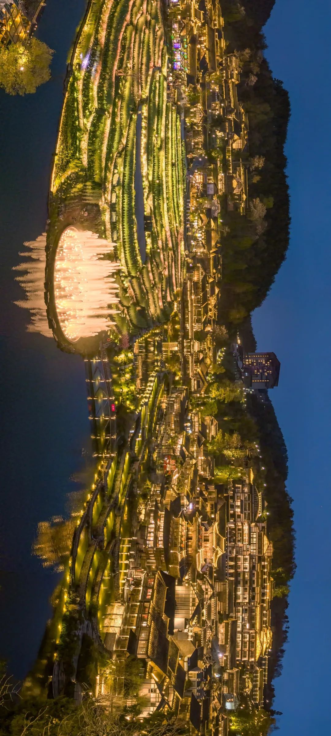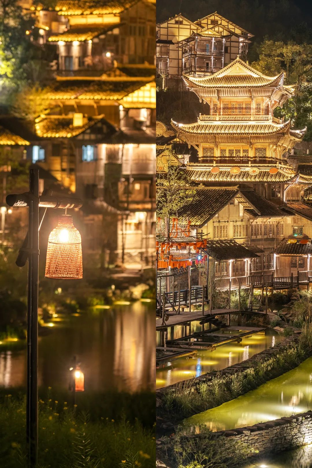 乌江寨夜景全景。这处年轻的贵州热门目的地,依托于典型的黔北村落改造。白天漫步其中,是两山襟河,吊脚楼与梯田沿线铺开的“烟雨”江南。而在夜间,乌江寨则一化恬然姿态为满满活力:可漫步于巷陌灯影里,感受百余家特色小店的深夜温暖,或是在广场上跳起贵州风情的“苗迪”,亦或是看一场赛博味儿十足的喷泉无人机表演……在乌江寨,你可以尽情沉醉在春风吹拂的良夜。
