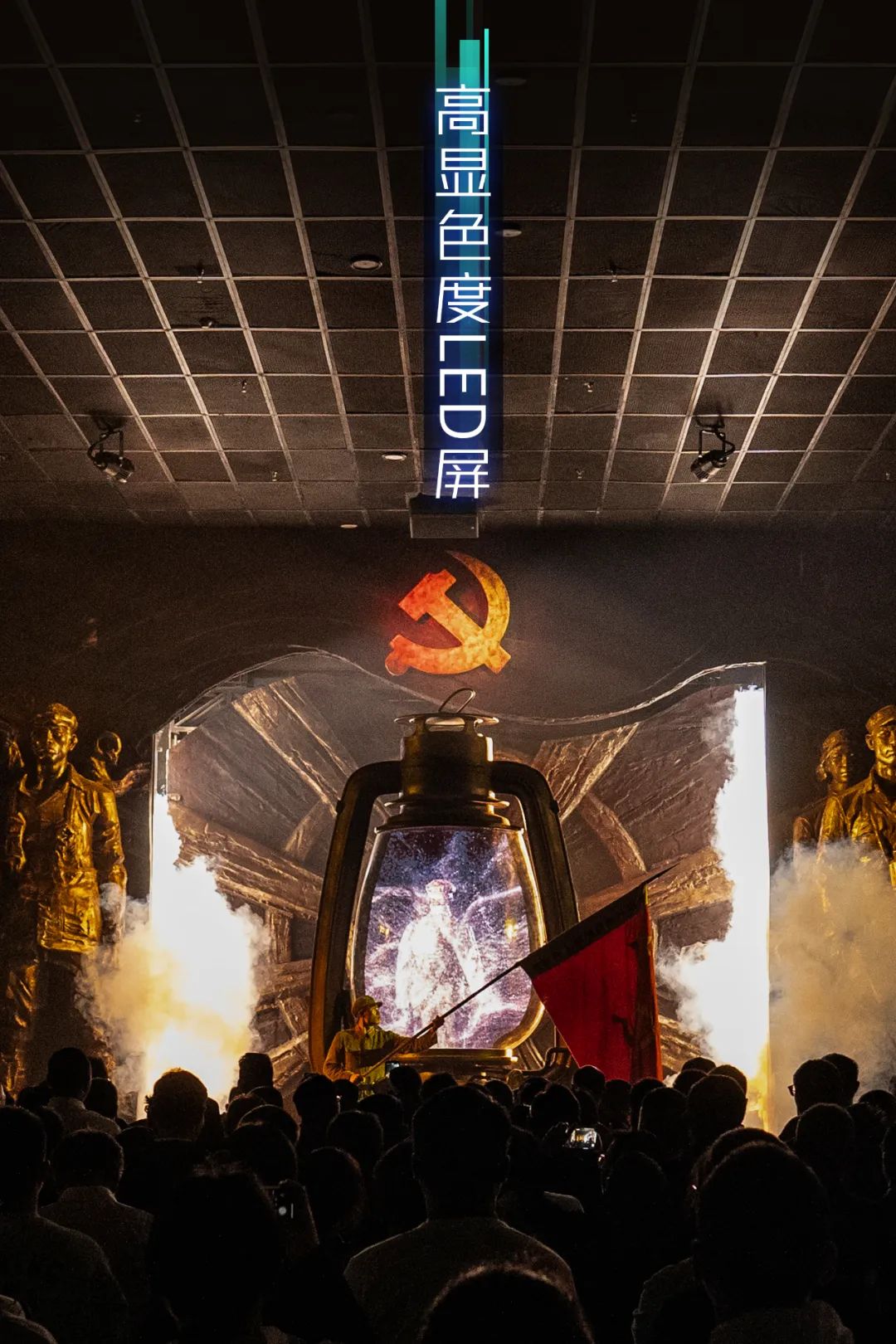 参观开篇的巨大马灯有着丰富的光影特效。在序章《无名英雄》中,一众无名战士的独白里,一盏坚定而明亮的巨型马灯,为长征史诗拉开序幕,高显色度LED屏与柔和的暖色调背景逆光,正使这盏马灯刚柔相济,是引导之灯,也为信念写照。