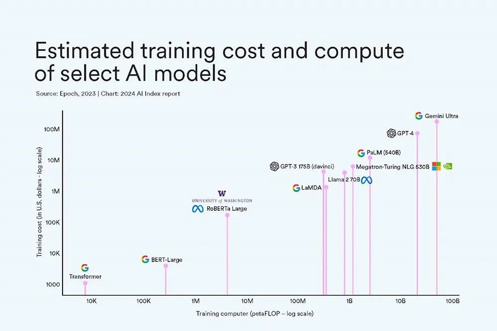 伴随而来的还有新兴能力和成本的急剧上升,目前这些成本已达到“天文数字”。正如半导体行业只有少数几家有能力负担最新数十亿美元芯片制造厂的公司,AI领域也可能很快被仅有的几家大型科技巨头及其合作伙伴所主导,只有它们能够承担开发类似GPT-4和Claude 3等最新大语言模型的巨额费用。