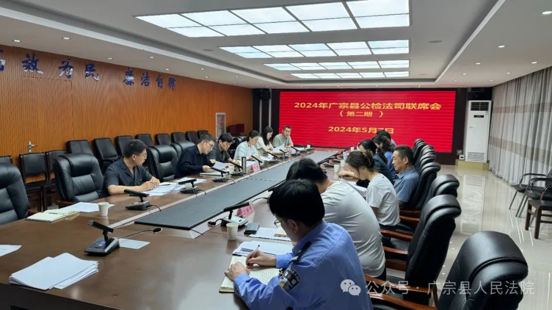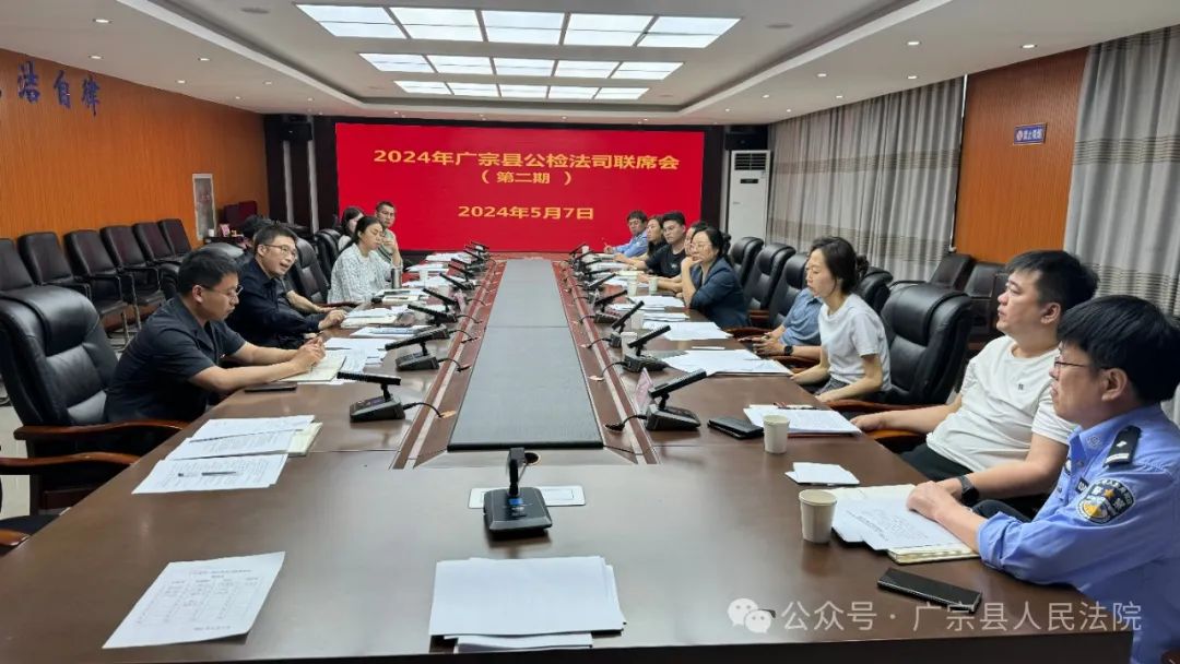 为进一步强化公检法司沟通协作,不断提高办案质效,共同推进严格公正司法,5月7日在广宗法院召开2024年度广宗县第二期公检法司联席会议。会议由广宗法院党组成员、副院长周金虎主持,县公安局、县检察院、县司法局分管领导及相关部门负责人参加会议。
