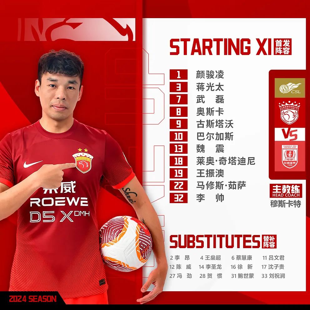 相较于上一场面对深圳的比赛,主帅穆斯卡特并未对首发进行任何调整。颜骏凌出任门将,魏震和蒋光太出任中后卫,李帅、王振澳分居左右。奇塔迪尼和茹萨出任双后腰,奥斯卡、武磊、古斯塔沃以及上一场收获帽子戏法的巴尔加斯出现在了中前场的位置。值得一提的是,张琳芃没有进入大名单,而刘祝润出现在了大名单中。