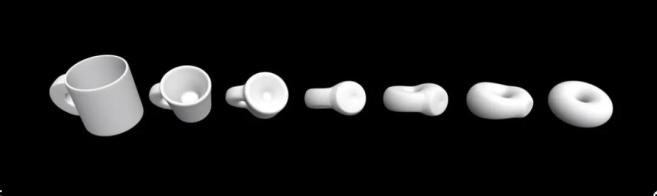 根据这种推理,咖啡杯和甜甜圈被认为是相同的,或者说是“拓扑等价的”,因为一个可以通过拉伸和弯曲变成另一个。