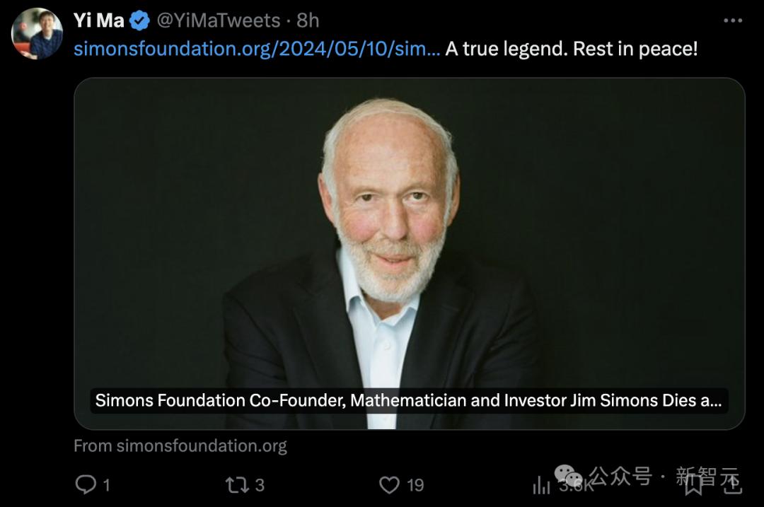 在推文中,马毅教授称赞Simons为「真正的传奇」。