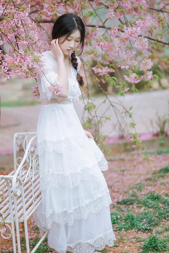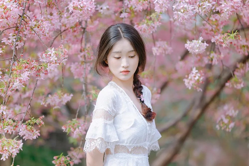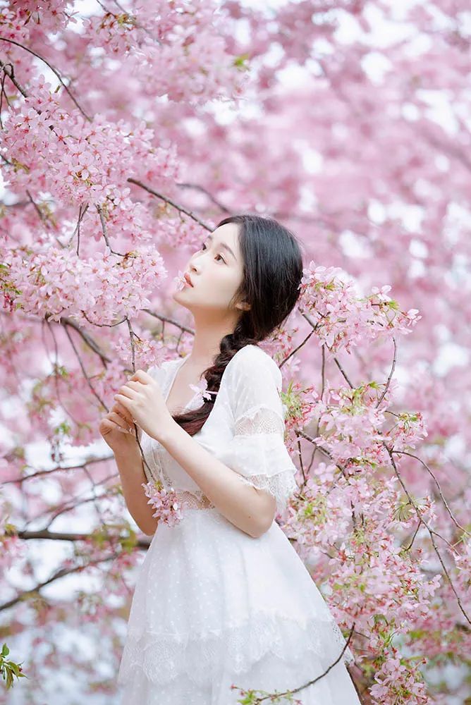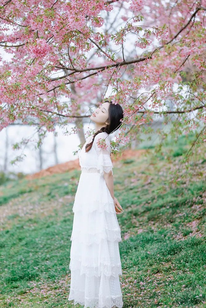 本次拍摄时间为11:00-13:00,本来期待的太阳并没有如约而至,遇上了大阴天。但是只要掌握一些小小的拍摄技巧,阴天也一样能拍出通透自然的照片。因为樱花是大片粉色占据整个画面的色彩,所以此次拍摄就选择了白色的法式长裙作为模特的拍摄穿搭。