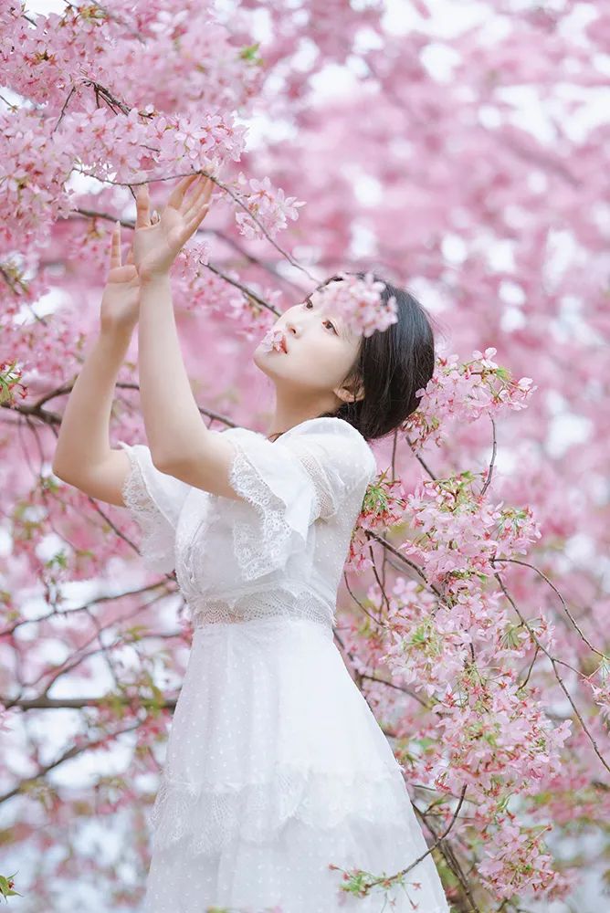 拍摄樱花主题,自然少不了用樱花做道具来呼应。我选择用一朵小小的樱花作为发饰,人物置于高处,整体没入花海之中,与环境的结合能更有效传递照片的情绪,还可以通过拍摄不同角度来增强照片整体的互动性。这个拍摄方法也适用于在花没有那么繁盛的情况下,前景和背景中有少量花朵,就能拍出花繁叶茂的“作弊”效果。