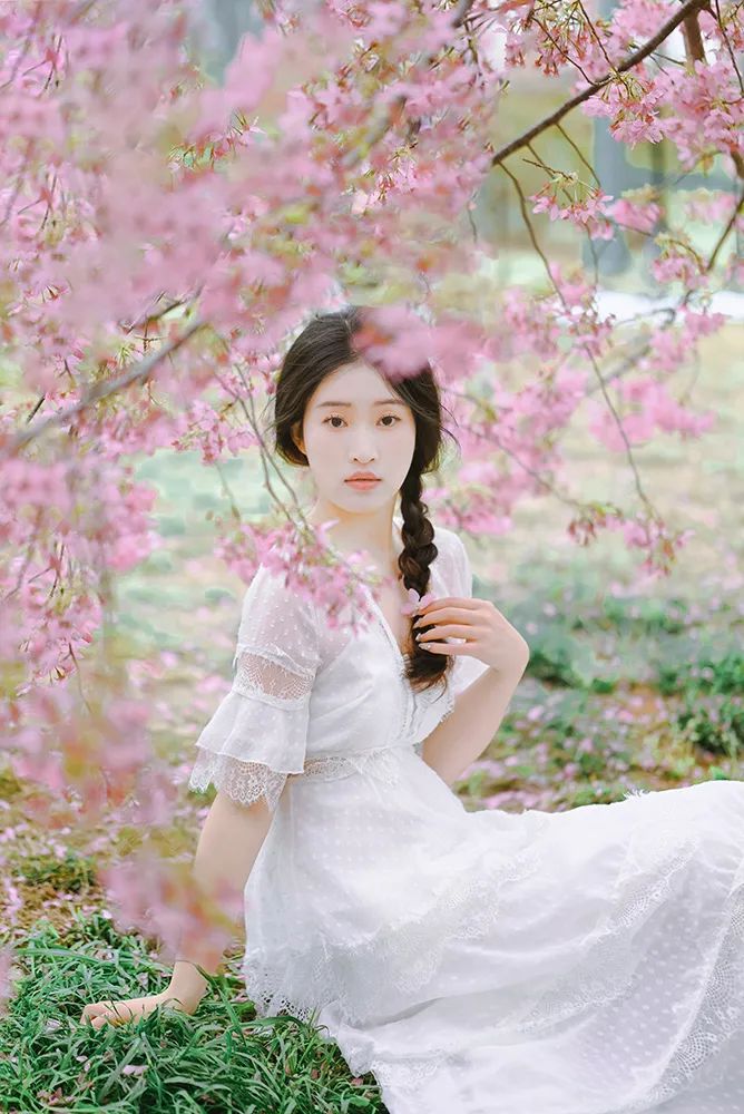 俯拍角度也是避开复杂环境的绝佳拍摄视角。这个角度一般可以让模特坐着或者躺在环境里,这样可以获得更高机位的画面,同时也能拍摄到地面掉落的粉色花瓣,为照片增添几分春日的意趣。