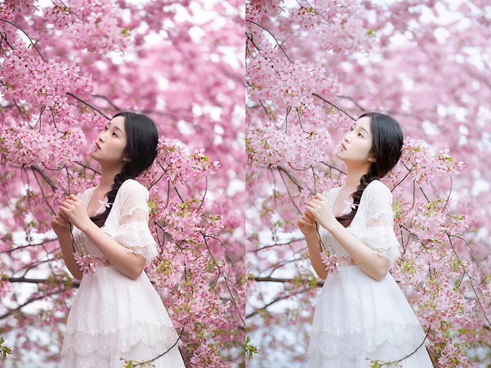 上图为一张调色前后对比图,因为主题是樱花人像,所以我就选择了一张樱花占主要画面的照片来作为调色案例,主要调整了樱花的粉色以及阴天低沉的影调。