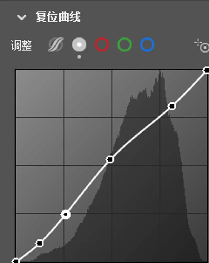 接下来调整曲线,我会更喜欢用这样一个曲线来控制整张照片的明暗,提高中间点压低高光和暗部。这样做的目的是整体提亮,适当增加对比度但压低了高光,能让画面明亮且柔和。