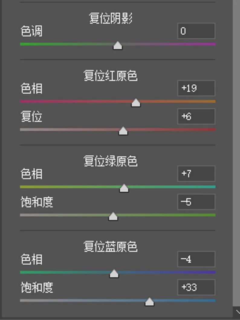 接下来,是调整画面的整体色彩风格。三原色的调整,在校准中先提高蓝色的饱和度,这一步可以让照片色彩明暗变得和谐统一。至于调整红色色相,可以调整红色的同时调整画面中紫色和橙色。
