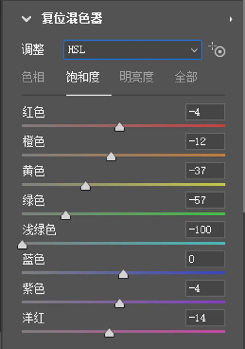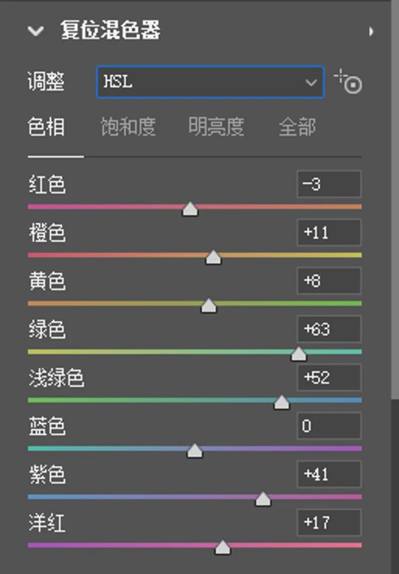 第二步,HSL的调整。这张图片中主要调整了控制画面樱花色彩的紫色、洋红,以及控制人物肤色的橙色和控制少量树叶的绿色、黄色。我希望得到偏暖色调的樱花,所以整体色彩都是区域暖色在做调整,低饱和度能让画面色彩更通透干净,人物的肤色偏黄,降低饱和度以及适当增加明度能够很好的修饰肤色,让皮肤更透白干净。