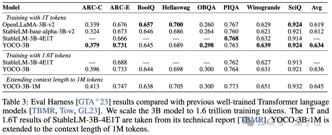 在LM Eval Harness的多个下游任务上,YOCO与Transformer模型OpenLLaMA-3B-v2、StableLM-base-alpha-3B-v2、StableLM-3B-4E1T打得有来有回。