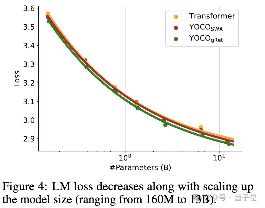 对比了它们在验证集上的语言模型损失,YOCO的表现与Transformer基本持平: