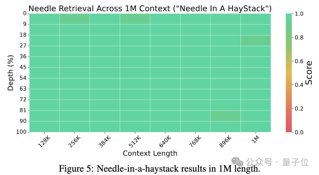 将3B的YOCO模型扩展到上下文为1M,在“大海捞针”等长序列的needle retrieval任务上,YOCO-3B-1M的准确率接近100%。