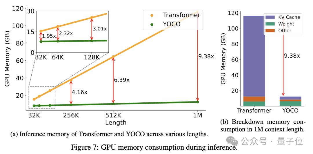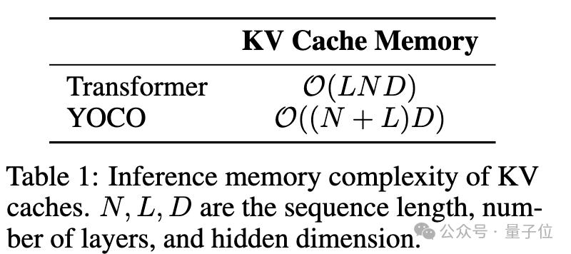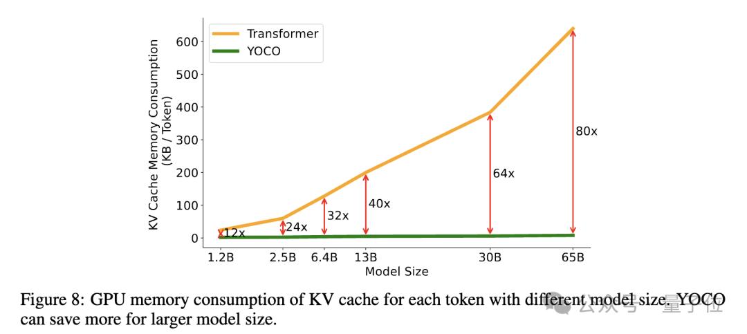 YOCO模型只缓存一层全局的键值对,因此与Transformer模型相比,它需要的内存约少了L(指模型的层数)倍。