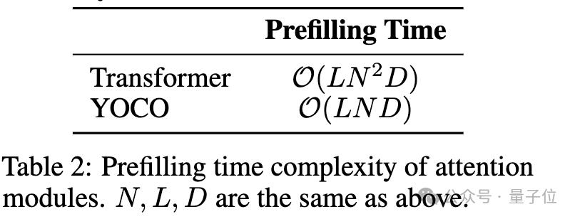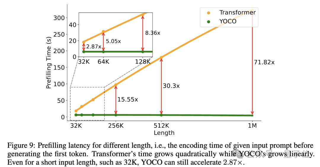 相比之下,YOCO的预填充时间为O(N),随序列长度线性增长。
