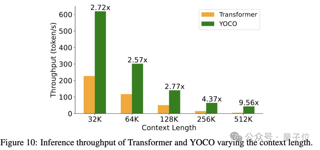 吞吐量表示模型每秒可以处理多少个token,涵盖了预填充和生成时间。如下图所示,与Transformer相比,YOCO在不同上下文长度下实现了更高的吞吐量。以512K查询为例,Transformer的吞吐量为4.5 token/秒,而YOCO达到了43.1token/秒,即实现了9.6倍的加速。