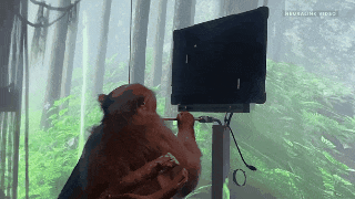 在试验后续阶段,猴子出于习惯还是会控制游戏手柄,但此时手柄的插头已经被拔掉,这时候,它其实是通过植入的大脑芯片,用意识来控制屏幕上的光标。图片来源:Neuralink