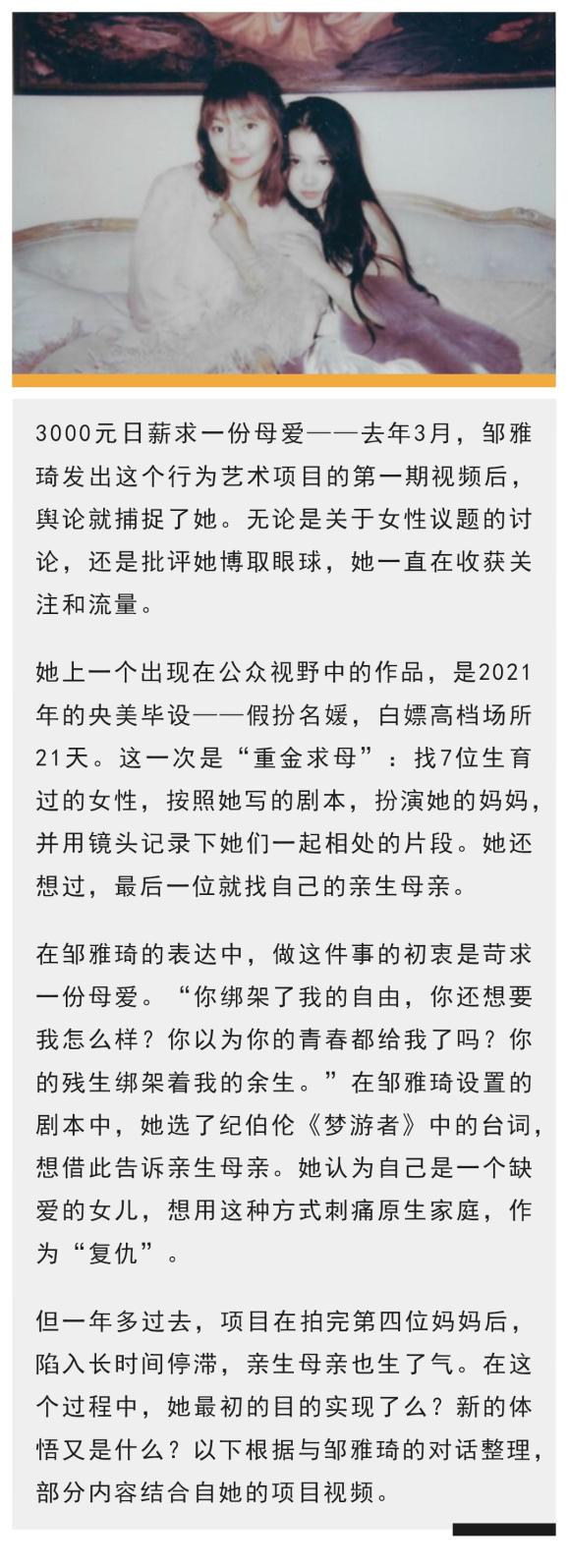 ——第二位妈妈30多岁,也从事艺术,有个小学五年级的孩子。录制时,邹雅琦在她面前一件件脱掉衣服,直到全裸,然后说出这句话。邹雅琦表达,这些也是要给亲生母亲看的。