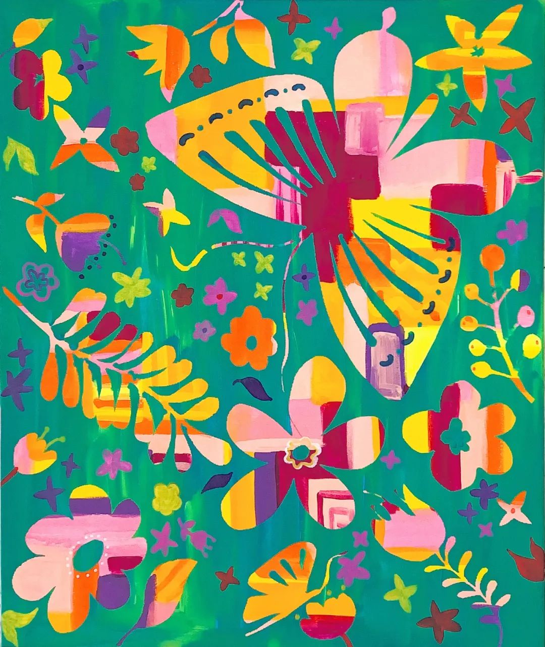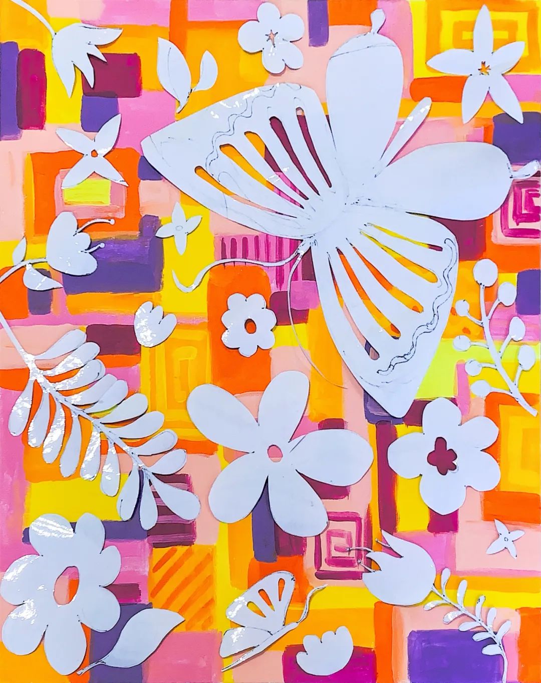 我们将用透明转移膜描绘出五彩缤纷的花朵,还有那些住在花园里的可爱小动物。剪下这些有趣的角色,贴在画布上的不同角落,然后用对比鲜明的背景色为这片花园增添层次与活力,展现它们和谐共生的美好画面。