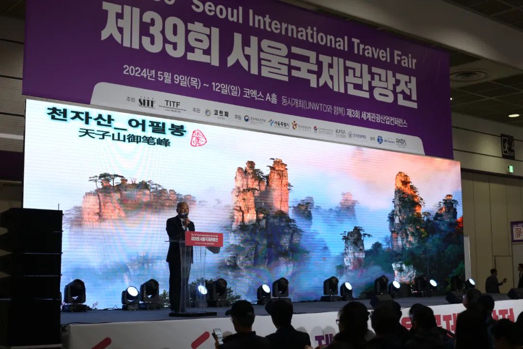 当天,刘革安应邀出席第39届首尔国际旅游展开幕式和张家界文化旅游专场推介会,中国驻首尔旅游办事处主任张若愚致辞。