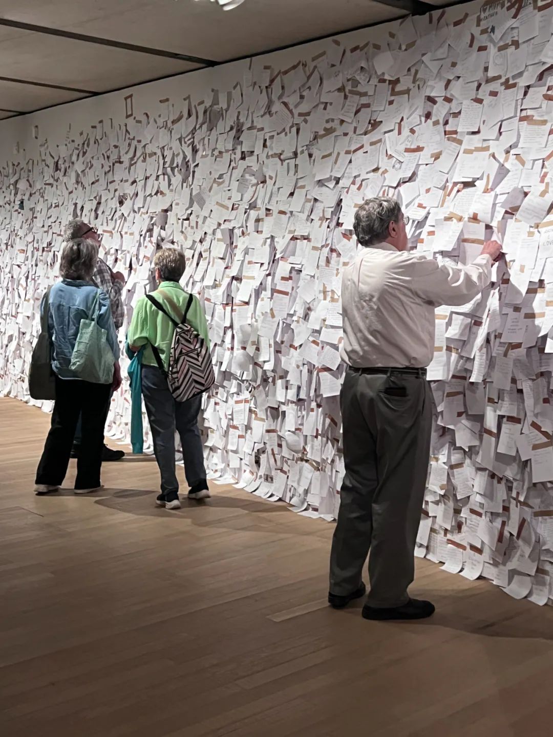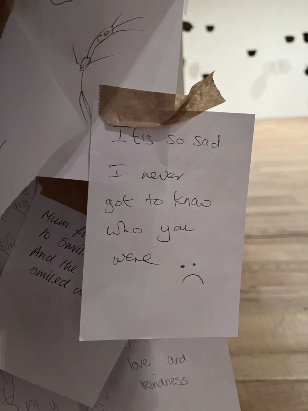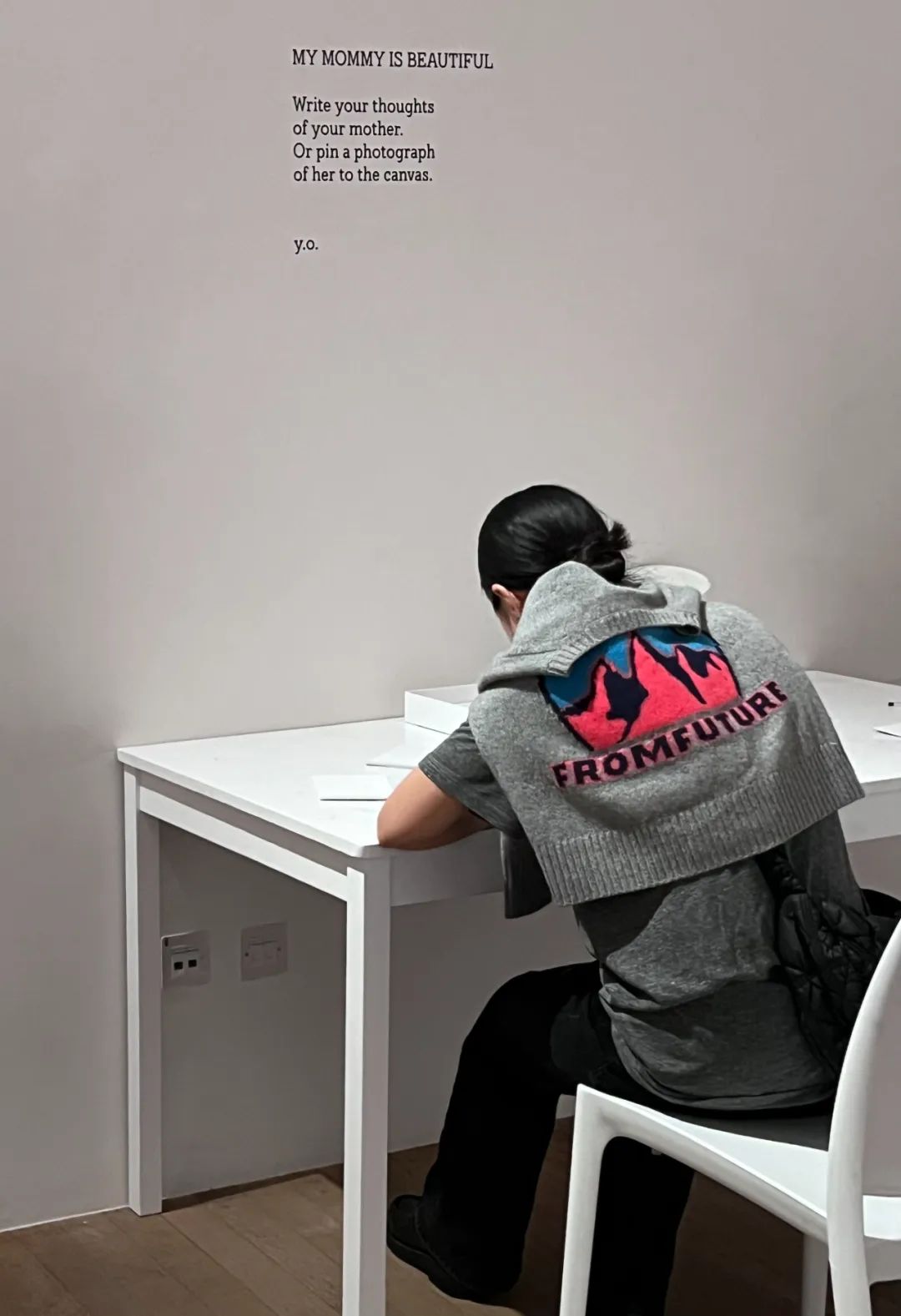 约翰·列侬、小野洋子和儿子西恩一个仅由四个单词组成的指令——“MY MOMMY IS BEAUTIFUL",邀请观众在她准备的纸片上,用文字或者照片表达每个人对于母亲的记忆或想法。