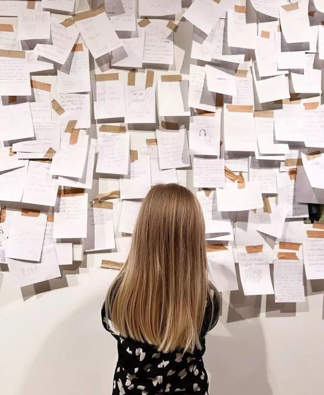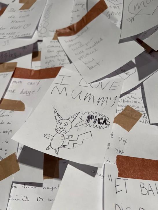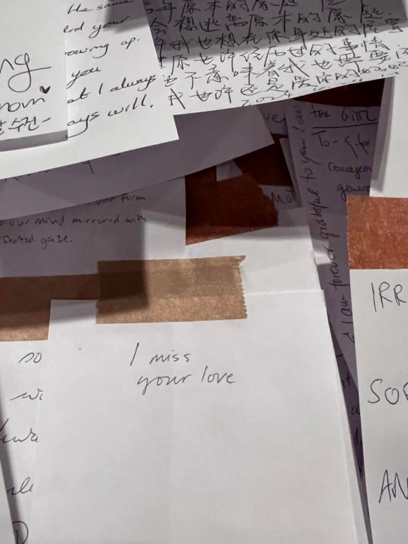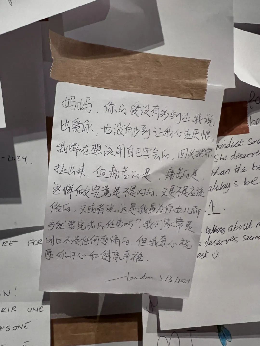 在这里,各种语言的小纸条贴满整个房间,每一张纸条都是一种亲子关系,每一段表述都是一段错综复杂的情感谜题。