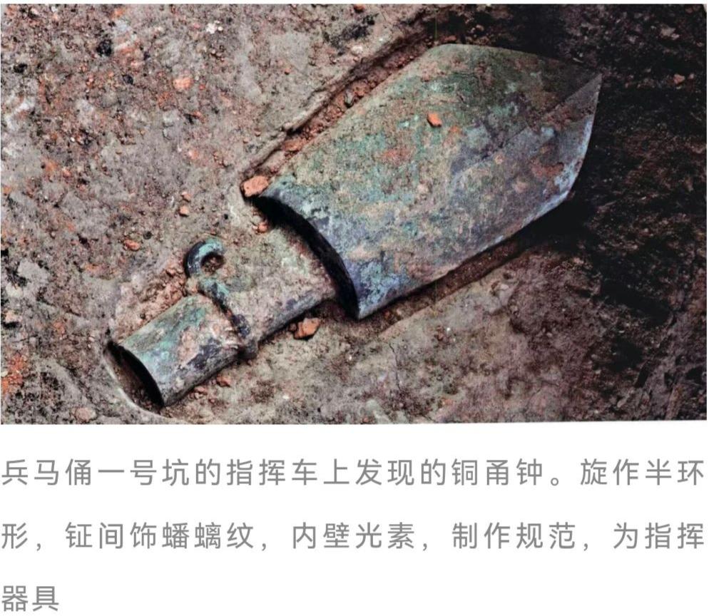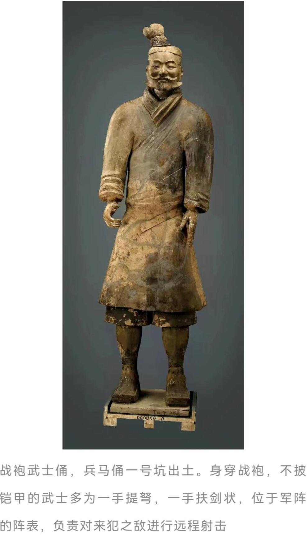 除了最前方阵表,位于一号坑南北两端边缘的坑道,以袍俑弩兵为主。这两条过洞里排列相似,每条坑道里的陶俑均为两列,位于内侧的陶俑呈面东(军阵前方)纵队排列,外侧陶俑则分别面南和面北排列。这样一来,整个一号坑就形成阵面士兵、南端坑道士兵(外侧)、北端坑道士兵(外侧)的视野可以分别警戒东、南、北三个方向。西面还有尚未修复完成的部分,也能看到有后卫部队面朝西方的陶俑,所以该军阵应该是四面以弩手警戒,对中间9个过洞的军队阵形成一层防护的方形阵。从陶俑状态、姿势综合推断,这应该是一个非战斗状态的方阵,将大量弩手置于阵表和两翼外侧,目的在于警戒防御,一旦出现敌情则迅速以强弩攻击,拒敌于方阵之外。除去前方和两翼的阵表,这个军阵的主体分布在9条过洞内,基本以4个陶俑为一排面东站立,形成36路纵队。目前从已修复的成果看,大部分过洞里都有战车,车上常列3人,中间为驭手,负责驾驶车马;左侧为戴降袙的高级军吏俑(俗称将军俑),是目前秦陵兵马俑发现级别最高的指挥官;右侧为戴板冠的普通军吏俑。战车附近还出土了鼓和钟,这些是战汉时期用于沙场指挥、鼓舞作战的重要器具。基本可以断定,过洞里这些承载着高级军吏俑的战车就是指挥车,列于这个位置除了指挥,还有督战作用。